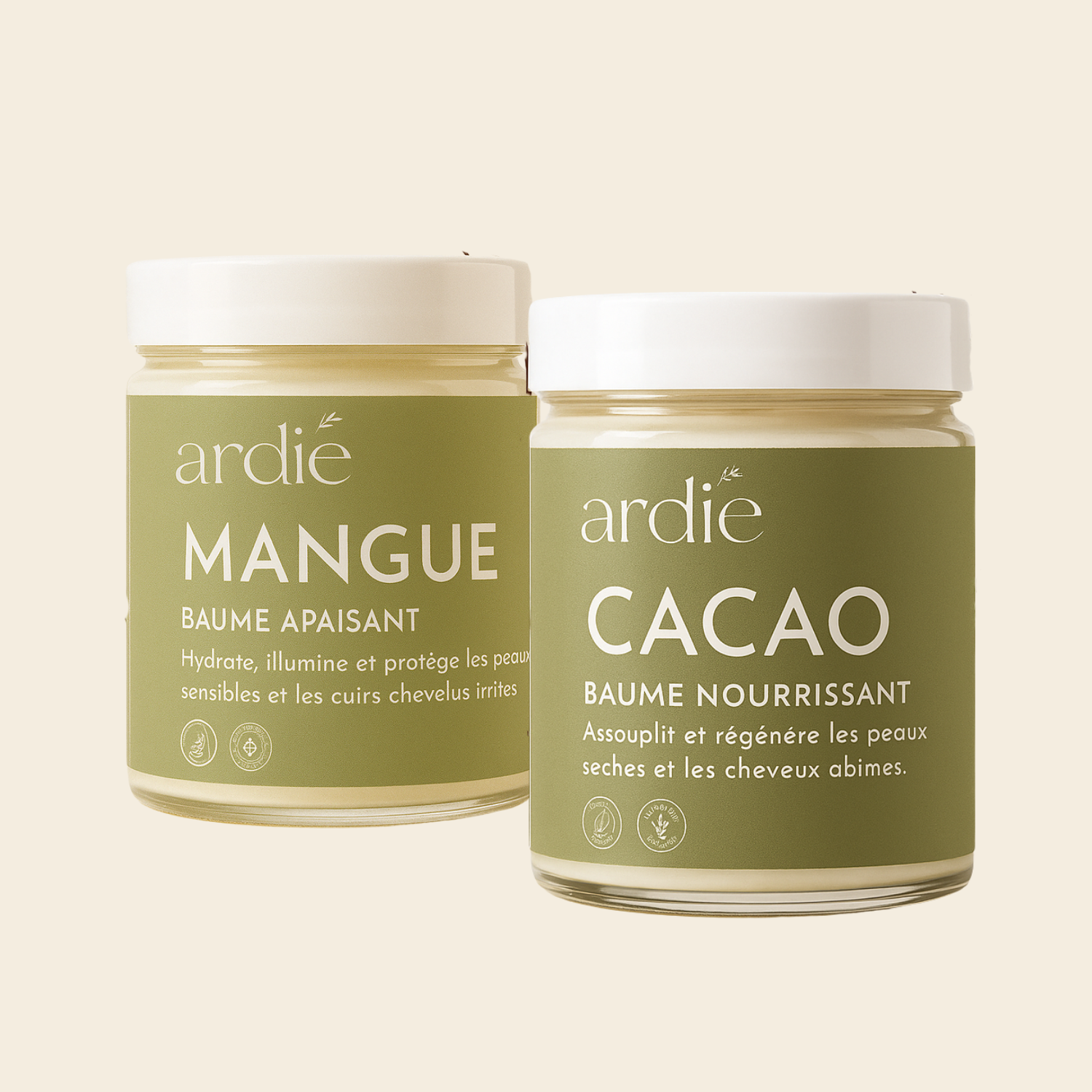 Le baume à la Mangue hydrate, calme et illumine les peaux sensibles, tandis que le baume au Cacao régénère et renforce les peaux sèches.
